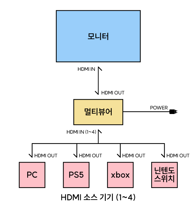 - 멀티뷰어 HDMI IN ─ ─ ─ HDMI OUT HDMI 소스 기기(4) (PC, 엑스박스, 스위치, 플스, 셋톱박스 등)